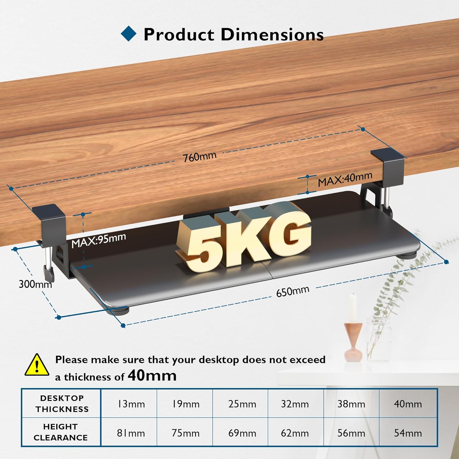 Measuring at 25.6 inches in width (30 inches including clamps) and 11.8 inches in depth, this sleek black keyboard tray is compatible with most desks and workstations. The included C-clamps ensure a secure and stable attachment to your desk, keeping your keyboard tray in place during use.